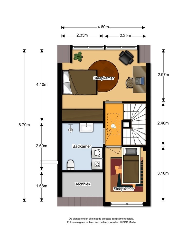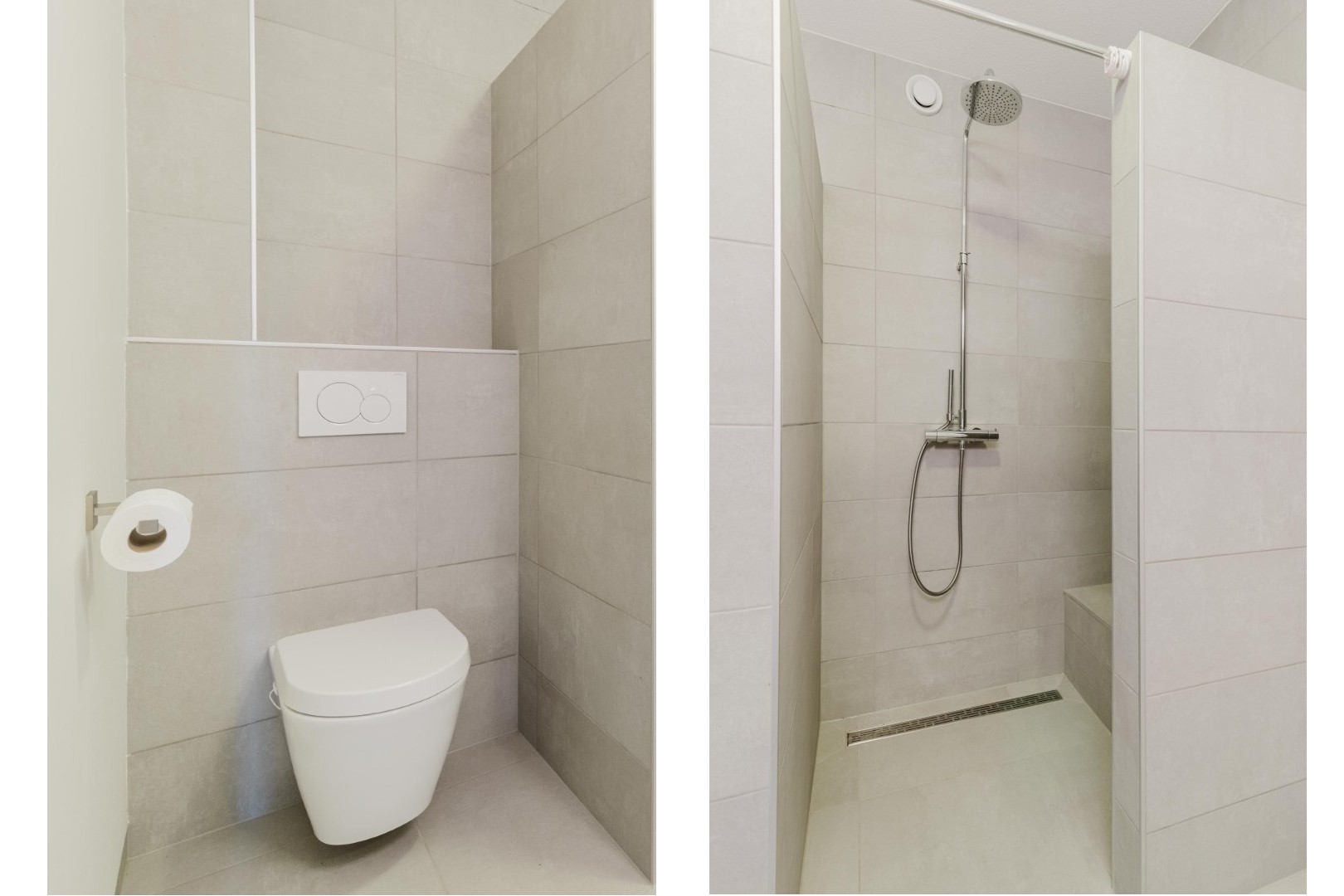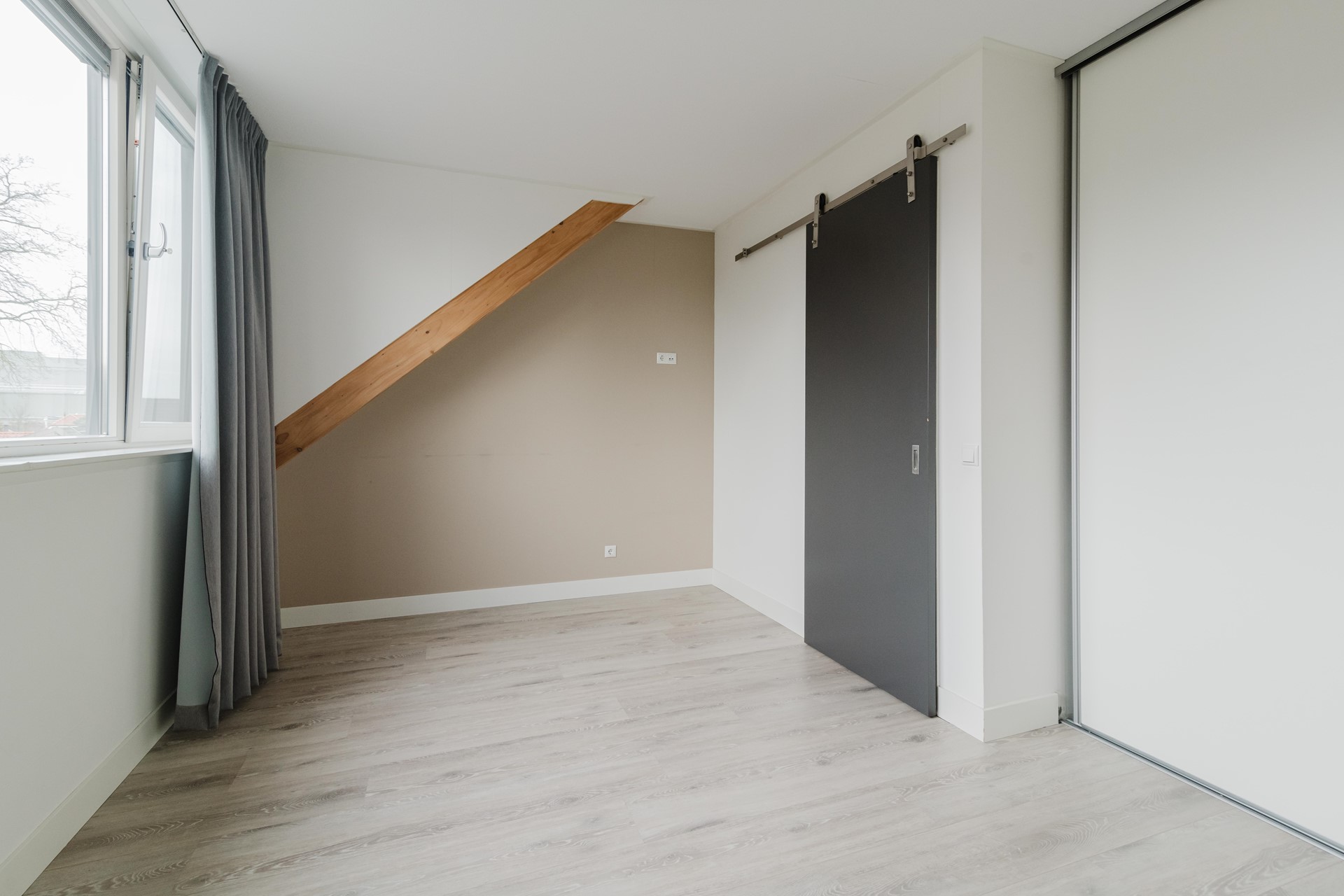 Op de eerste verdieping bevinden zich twee comfortabele slaapkamers, waarbij één kamer is voorzien van een ruime kastenwand. De slaapkamer aan de voorzijde van de woning beschikt over een aparte ruimte, ideaal voor extra opbergruimte. De badkamer is modern uitgevoerd en voorzien van een inloopdouche, wastafelmeubel en toilet.